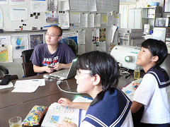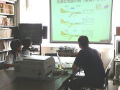 江南市立宮田中学校生徒2名から総合学習で「地震について」学びたいという要望を受けて、地震火山・防災研究センターの中道治久助手が地球の構造,世界の地震とプレート,地震の仕組み,東海地震,東南海地震,南海地震について,地震に対する普段からの備えと起こったときの対応についての講義をしました。生徒2名とも熱心に聞き入って,ノートに書き留めながら積極的に質問をしていました。