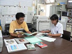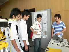 2006年8月9日から11日の3日間、高校2年生を対象に名古屋大学の研究・教育について紹介する説明会が開催されました。理学部の説明会は昨年と同様8月10日に行われ、今回は学科毎の懇談会という形式で、地球惑星科学科は環境総合館1Fレクチャーホールで14:30-(1部は78名参加),15:30-(2部は15名参加)の2回実施されました。地球惑星科学科の全体説明後、各講座毎の説明が行われ、地球惑星ダイナミクス講座ではポスターや実際に使用している地震計や測量用GPSなどの説明をしながら研究紹介をしました。施設見学は別に13:00-17:00の間、説明会に参加した高校生等が自由に研究施設を訪問するシステムで、地震火山・防災研究センターでは担当教員がセンターの研究紹介や説明を随時行いました。将来、地震火山について学びたいと当センターを目指して訪問しに来た高校生等は22名で皆、真剣に教員の説明を聞き、質問をしていました。