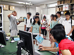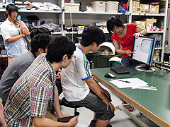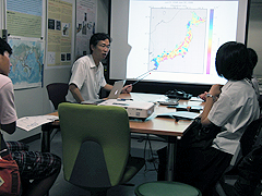 2013年8月7日から9日の3日間、名古屋大学へ入学を希望する高校生を対象に、本学の教育研究の紹介や施設見学を通して、進学の目的意識を持っていただくためオープンキャンパスが開催されました。今年度の理学部企画のスケジュールでは、豊田講堂で9:45から理学部紹介があり、地球惑星科学科懇談会を経て、地震火山研究センターの研究室体験ツアーは行われました。地震火山研究センターでは、研究紹介を理学部E館105で、観測装置展示を107で実施しました。この日訪問した高校生は100名以上