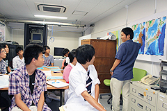 2014年8月6日から8日の3日間、名古屋大学へ入学を希望する高校生を対象に、本学の教育研究の紹介や施設見学を通して、進学の目的意識を持っていただくためオープンキャンパスが開催されました。今年度の理学部企画のスケジュールでは、豊田講堂で9:45から理学部紹介があり、理学部懇談会を経て、地球惑星科学科の研究室体験ツアーが行われました。地震火山研究センターでは、研究紹介を理学部E館105で、観測装置展示を107で実施しました。この日訪問した高校生は100名以上