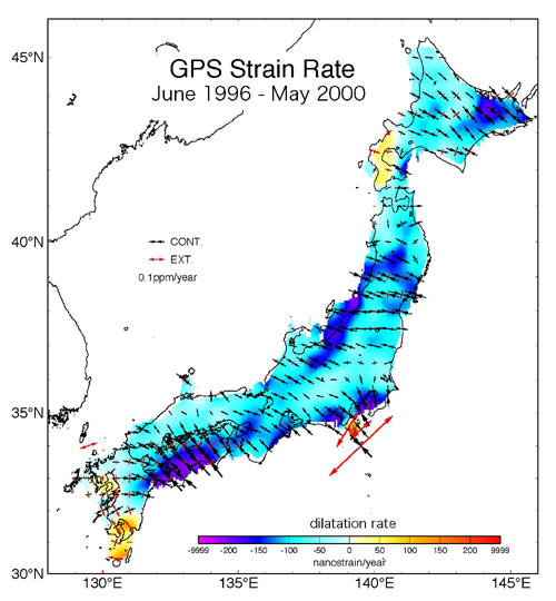 GPS観測によって得られた日本列島の歪み速度の分布です.背景の色は,各地域の地殻の伸び縮みの程度を表しており,日本列島の殆どが寒色系で,縮んでいることが分かります.縮みの大きい場所は,プレートが沈み込んでいる太平洋側に多く見られますが,新潟付近から南西方向に縮みの大きい地域が帯状に連なっているのが認められます.この帯状の地域は,近畿地方まで連なっており,「新潟ー神戸歪み集中帯」と呼ばれています.