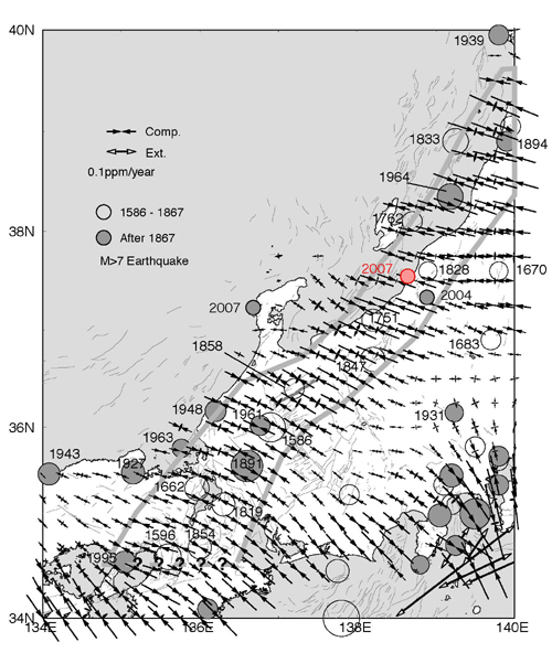していることが分かります.大地震の分布は新潟よりも北の日本海沿岸に沿っても延びています.2004年新潟県中越地震や2007年新潟県中越沖地震は,歪み集中帯で過去数百年間に大地震が発生していなかった地震空白域で発生しました.