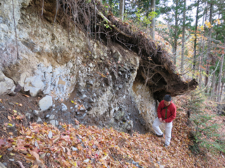 御嶽神社 里社若宮の参道沿いの崖で見られる木曽川泥流の岩屑なだれ堆積物です。左側の大きな岩塊には、岩屑なだれ堆積物の特徴であるジグソークラックが見られます。