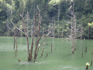 自然湖は、1984年の長野県西部地震による御嶽崩れ(伝上崩壊)による岩屑なだれー土石流で王滝川が堰き止められてできた湖です。美しい湖の風景の中に、何か違和感があります。そう、湖面から突き出た立ち枯れの林です。こうした違和感から自然災害のにおいを感じ取ったあなたは、防災マイスターになれるかも。現在、自然湖ではカヌーツアーなどのレクリエーションも行われています。痛ましい災害の跡ですが、年月を経て、御嶽山の恵みの一つとなっているのですね。この湖は通称「自然湖」と呼ばれていますが、自然湖とか天然湖というのは、自然の作用できた湖という意味の一般名詞です。王滝川には、牧尾ダムによる「御岳湖」、三浦ダムによる「三浦湖」といった大きな人造湖がありますが、これに対比して呼ばれるようになったのでしょう。