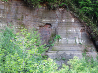 自然湖から更に西に進むと王滝村滝越地区があります。この近くの崖で、縞々の地層が水平に堆積している露頭が見られます。