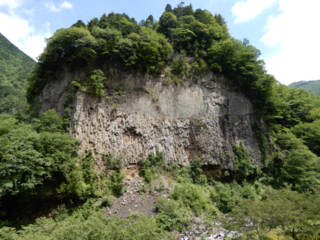 岐阜県下呂市小坂町のがんだて公園では、御嶽山の安山岩質の溶岩流の断面を見ることができます。新期御嶽火山のうち草木谷火山の溶岩流とみられています。柱状節理の発達が見事です。長野県木曽地域で安山岩溶岩といえば板状節理という印象がありました。地質図の説明によると「巌立」は1枚の溶岩流とのことですが、柱状節理は、崖の上部は細く、下部は太く割れています。一連の溶岩流ではあるものの、二層が時間差で流れて来て、上下で溶岩の性質が異なっていたのでしょうか。それとも、上面(空気)と下面(礫層)とで接する物が違うので冷え方が異なるために割れ方に違いが出たのでしょうか。境界部がかなり明瞭なので、後者では、説明が難しい気がします。いろいろ考えているとすぐに時間が経ってしまいますね。なお、この溶岩が流れたのは約5万4千年前。溶岩中で見つかった炭化した樹幹を炭素14の時計で測定して分かりました。(國友孝洋)