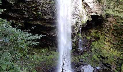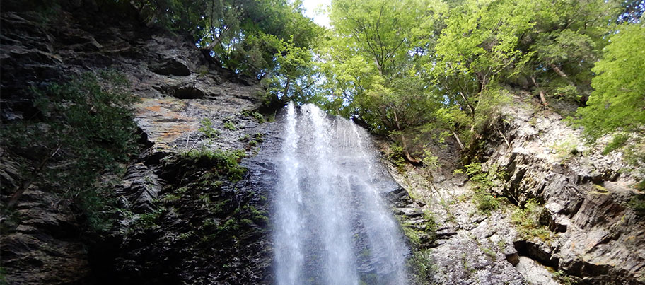 王滝村の新滝(落差約30m)は滝行にも使われており、私が御嶽山で初めて「畏れ」を意識したスポットです。古期御嶽火山の溶岩流の末端部にできた滝で、安山岩質溶岩の崖には見事な板状節理が発達しています。