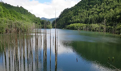 自然湖は、1984年の長野県西部地震による御嶽崩れ(伝上崩壊)による岩屑なだれー土石流で王滝川が堰き止められてできた湖です。美しい湖の風景の中に、何か違和感があります。そう、湖面から突き出た立ち枯れの林です。