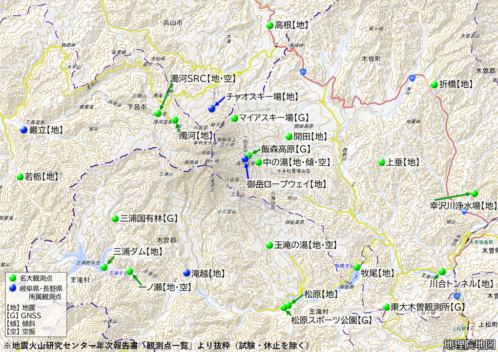 名古屋大学では、1976年頃から御嶽山地域での地震観測を行っています。観測点は1979年から始まった御嶽山の噴火や1984年の長野県西部地震などを受けて徐々に増設してきました。2014年の御嶽山噴火後には、より山頂に近い場所に地震観測点やGPSの常時観測点が新設されました。これらの観測データは、御嶽山の火山活動や御嶽地域の群発地震活動の研究に用いられています。データは、リアルタイムに気象庁にも送られており、火山監視や警報業務に用いられています。また、この他にも観測機器の試験運用を兼ねて頂上火口域周辺に地震計を設置し、データの収集を行っています。