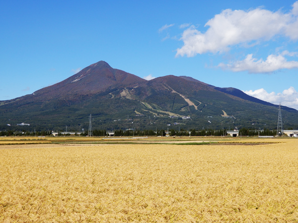 金色の稲穂の向こうに見える磐梯山(2018年10月8日國友撮影)。山体崩壊跡が見える裏磐梯の写真がなかったため表側の写真となりましたが、今後取材に行ったら更新させて頂きます。