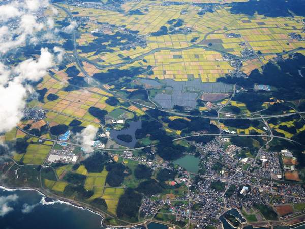 名古屋から秋田の火山学会へ向かう機上から撮影した鳥海山の流れ山群(2018年9月25日國友撮影)。残念ながら象潟上空には雲がかかっていましたが、すぐ北の金浦(このうら)付近の流れ山群を撮影することができました。中に島がある矢印のように見えるのは竹嶋潟です。その矢印の先には、メガソーラー発電所が見えます。