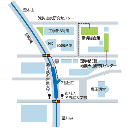 〒464-8601 名古屋市千種区不老町 地震火山研究センター事務室(E407, 内線:3046)