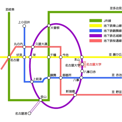 - 地下鉄東山線藤が丘行きに乗車し、本山駅で地下鉄名城線右回り(八事方面)に乗り換え、名古屋大学駅下車。所要時間約30分(乗換含)