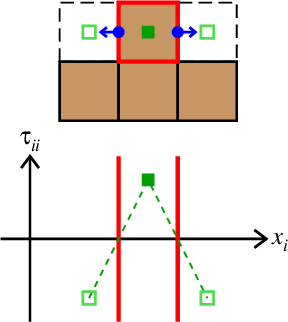 ![]() 図3. 格子セルと物理領域、PML領域の関係。領域の塗りつぶし色は図1と同じ。 Fig. 3. Relation between grid cells and the physical and PML volumes. The fill colors for the volumes are consistent with those of Fig. 1. |
