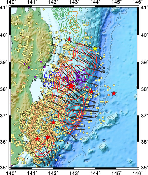 赤いコンターは今回の地震のすべり分布.緑のコンターは1968年十勝沖,茶色い コンターは1994年三陸はるか沖地震,青いコンターは1978年宮城沖のすべり分布を示す. ただしコンター間隔等はそれぞれ違う. 紫のコンターは2011/3/9に起こった地震のすべり分布.● は本震後の地震活動,●は本震後1日以内 に起きた地震活動,●は本震前の地震活動. ★は今回の余震でM7以上の震央