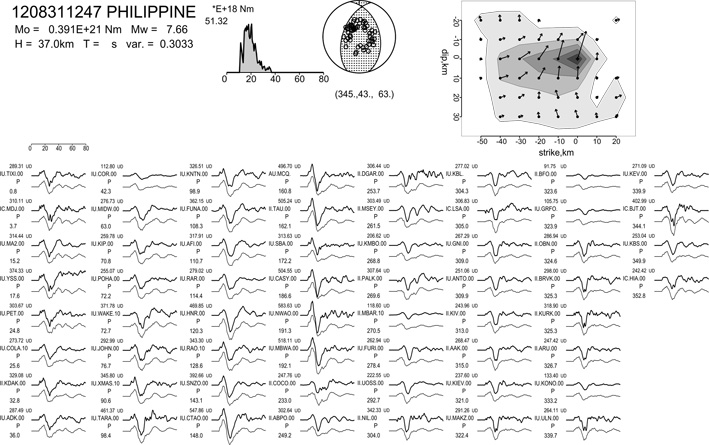 ●解釈その他:沈み込むプレート内の地震と考えられます.西傾斜の断層でも 計算してみましたが,東傾斜の方が波形のあいがよいのでこちらを断層としました. 日本でも津波注意報がでましたが,フィリピンでも津波は小さかったようです.