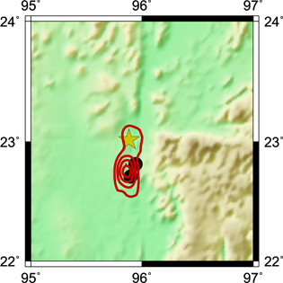 ●解釈その他:ちょうどインドプレートとスンダプレートの境界(Sagaing断層)で起こった 地震と思われます。過去に近くで1946年(M7.5),1991年(M7,3)などの地震が起きているようです。