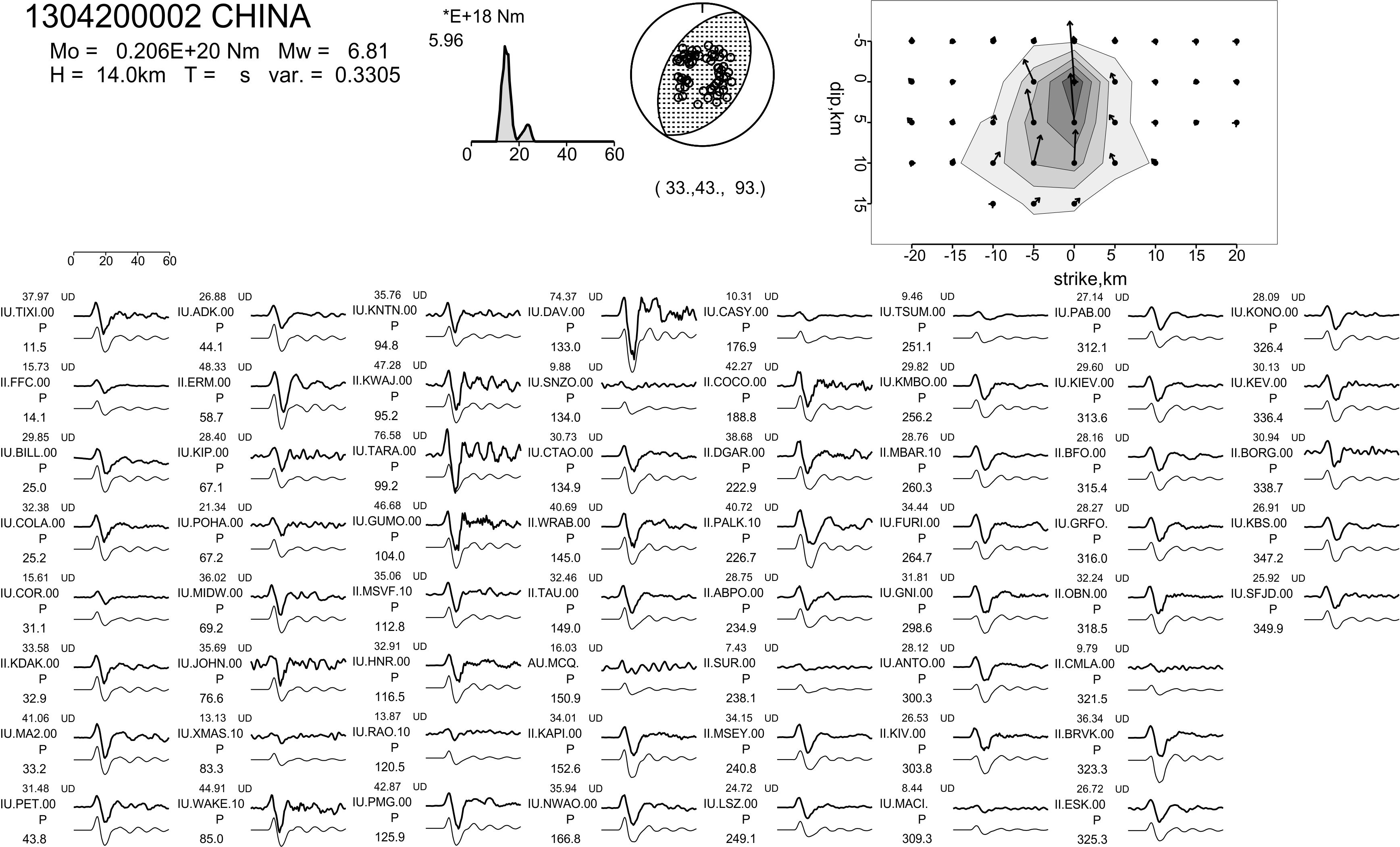 ●データ処理: IRIS-DMCから収集した広帯域地震計記録(P波上下動61,SH波4) を用いて