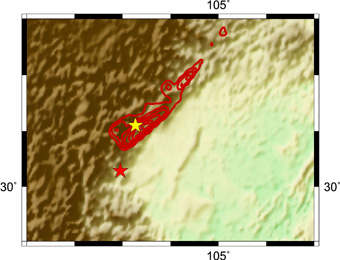 ★は震央.赤いコンターは2008年四川地震の滑り分布. ★は2008年四川地震の震央.