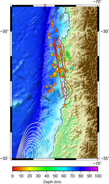 図2 滑り分布(赤いコンターは今回の地震,白いコンターは2010年の地震[Yoshimoto & Yamanaka, 2014])とUSGSによる9/21までの余震活動分布(★の色は深さを示す),