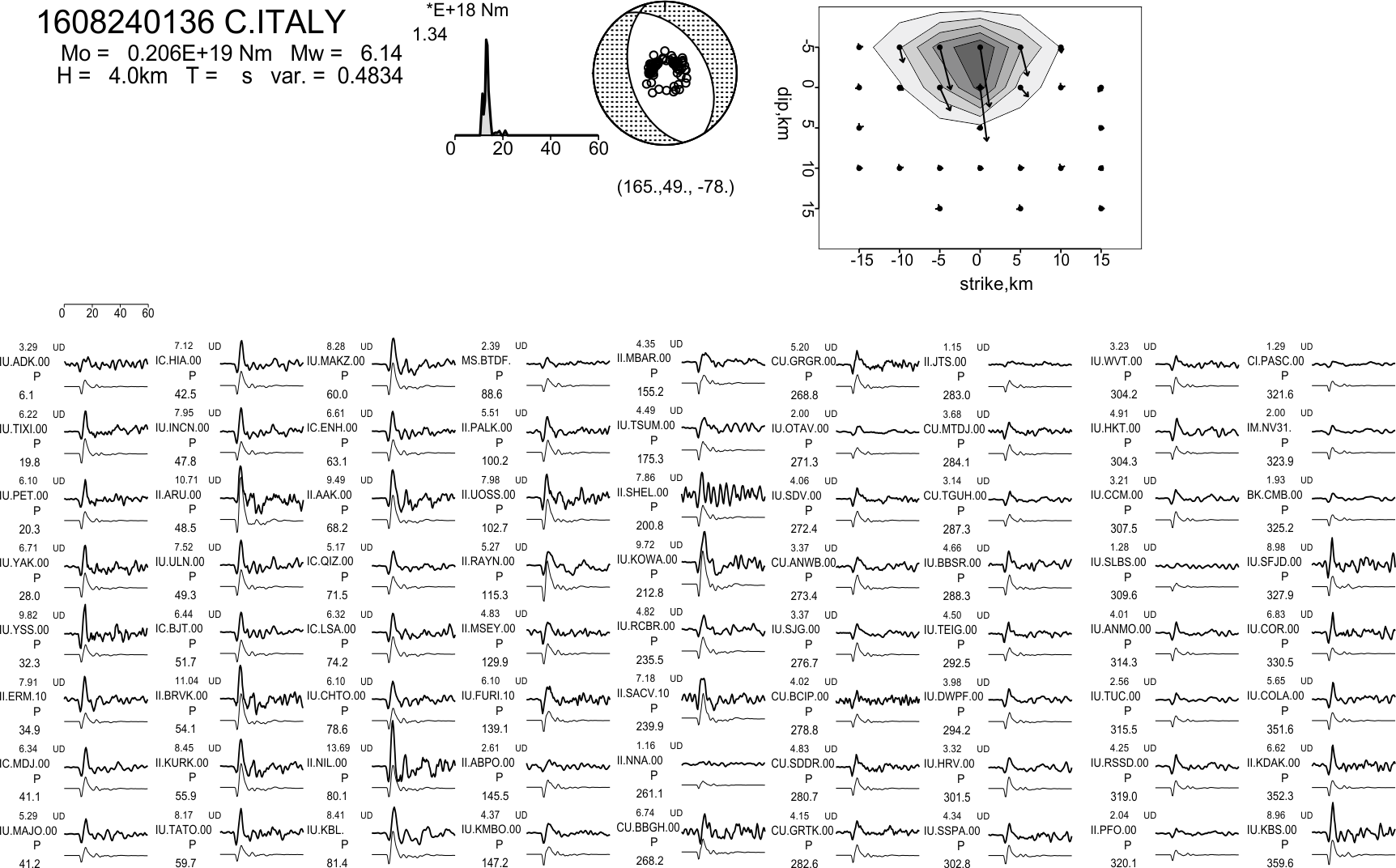 走向、傾斜、すべり角 = (165,49,-78) 地震モーメント Mo = 2.1 x10**18 Nm (Mw = 6.1) 破壊継続時間(主破壊) T = 7 s 深さ H = 4 km