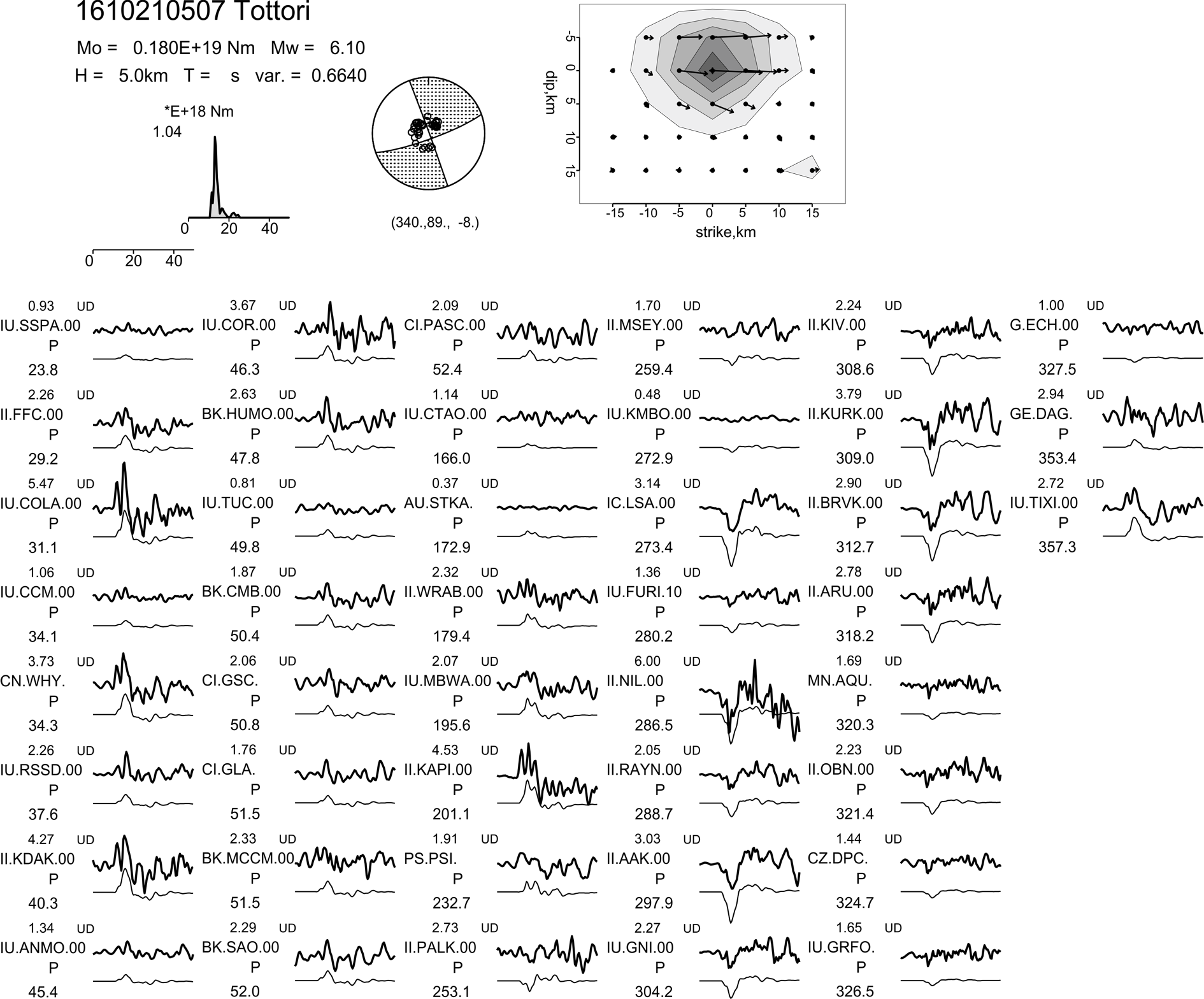 走向、傾斜、すべり角 = (340,89,-8) 地震モーメント Mo = 1.8 x10**18 Nm (Mw = 6.1) 破壊継続時間(主破壊) T = 5 s 深さ H = 5 km